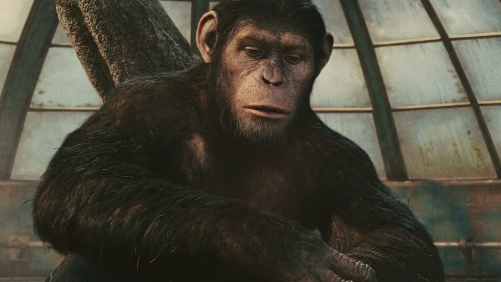 The decision to keep Caesar relatively pale, especially as he ages, diverges from the natural progression observed in real chimpanzees. In contrast, by the third movie, all the adult chimpanzees and gorillas were now highly pigmented, except for an albino gorilla named Winter. The few orangutans sprinkled in the movie still stayed true to the real-life animal.