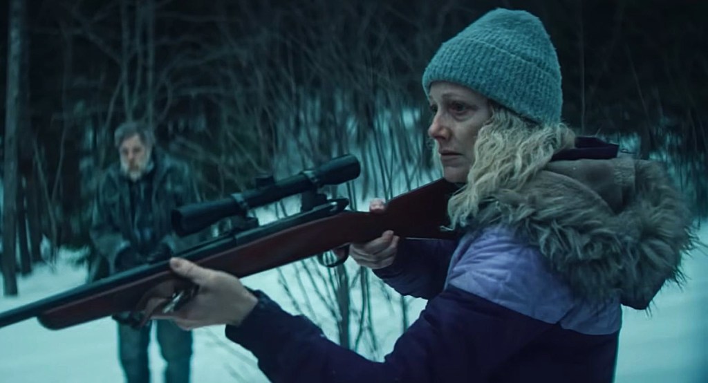 Barb’s path crosses with a married couple played by Marc Menchaca and Judy Greer. He is taciturn and wary. She is wired, impatient, and very dangerous. Their cabin is more trap than home, and what Barb finds in the basement is enough to pull her into a rescue she did not plan for and cannot ignore. The plot from there is straightforward. A chase forms across woods, frozen water, and claustrophobic rooms. People make bad choices because the weather, fear, and pain are shrinking their options by the minute.